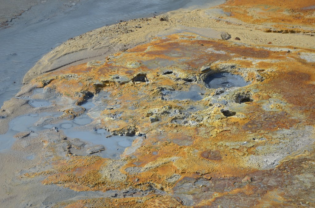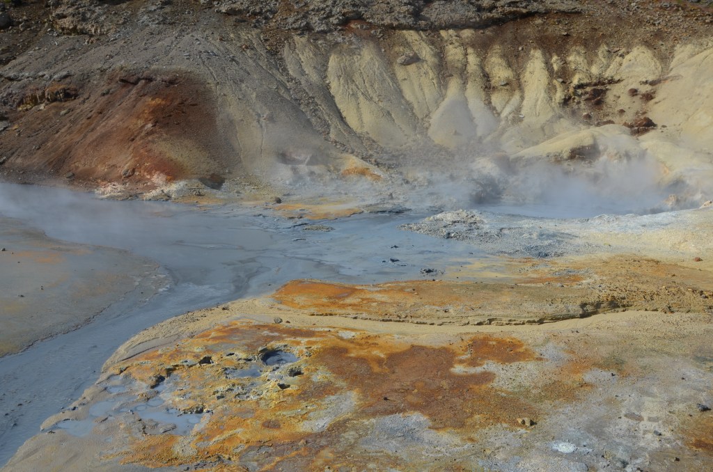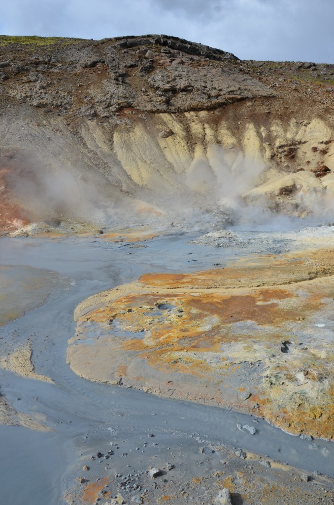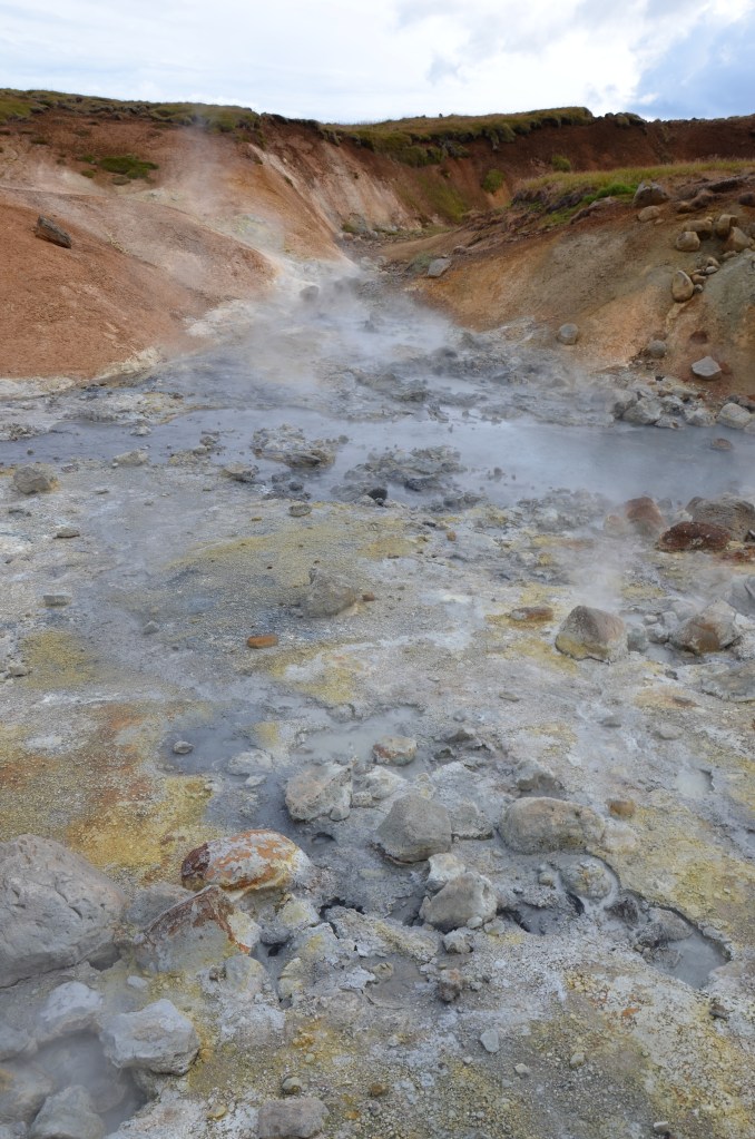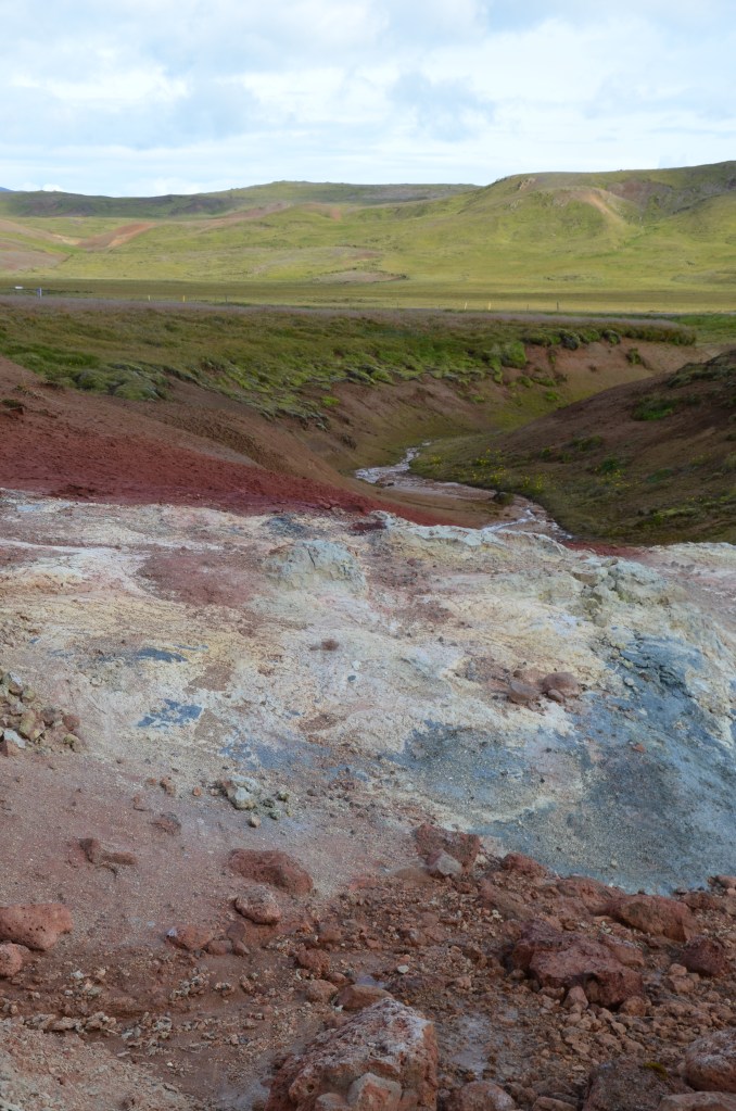 Seltún ist ein Solfatarengebiet im Vulkansystem Krýsuvík. Solfataren sind Stellen, an denen heiße vulkanische Gase austreten, speziell Schwefelwasserstoff. Heißt: es stinkt wie Hulle. Zum Glück sieht man davon nichts auf den Bildern.