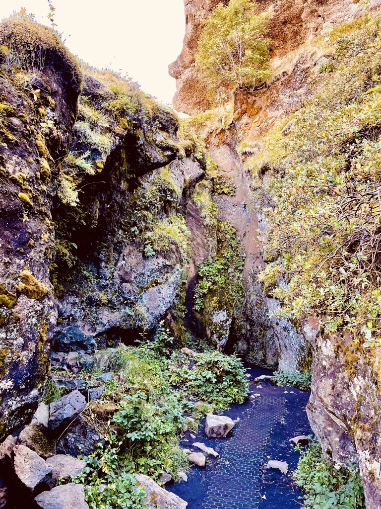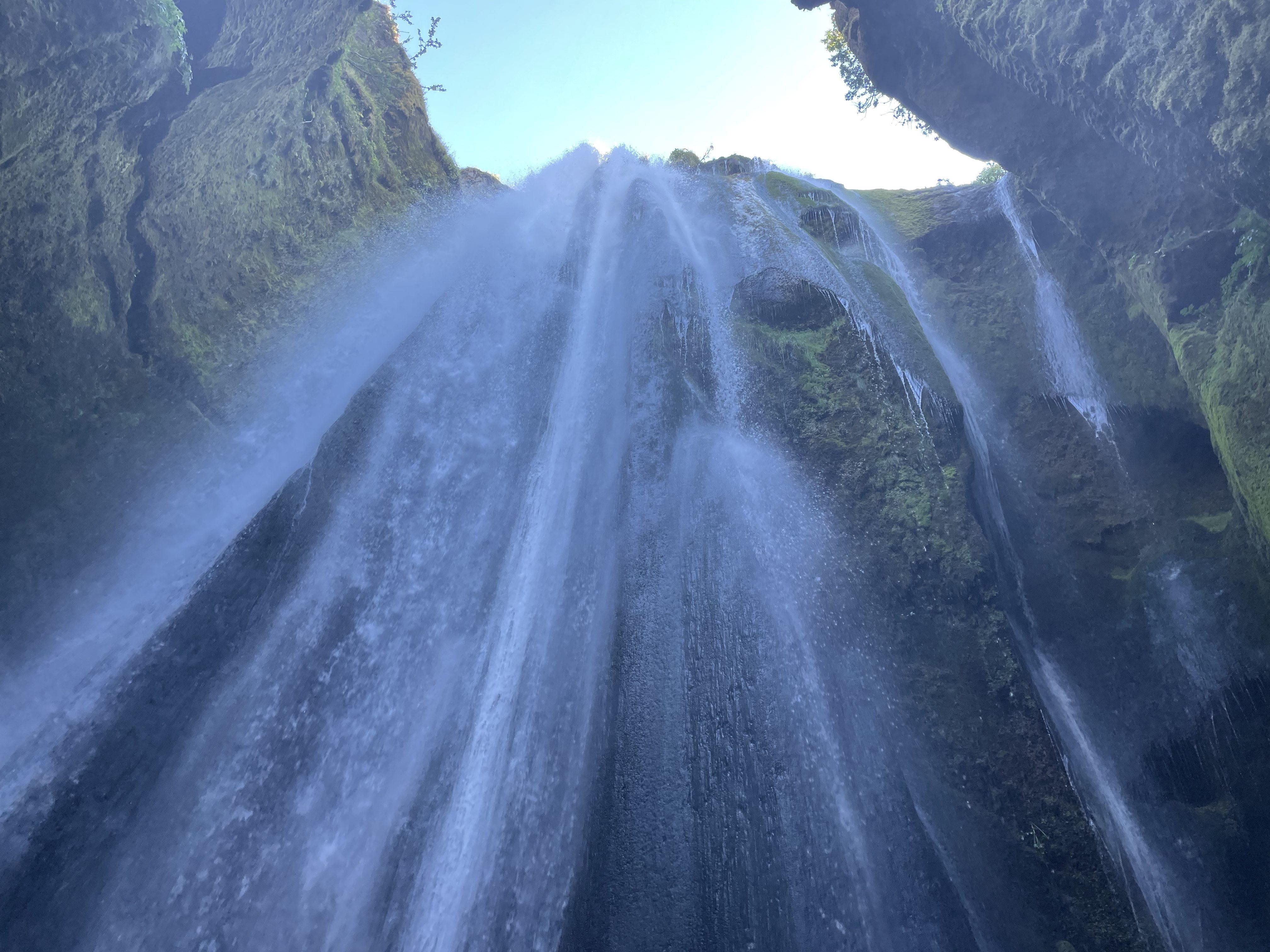 Der Gljúfrabúi ist ein zweiter Wasserfall und nur wenige Meter neben dem Seljalandsfoss zu finden. Er mündet in eine oben offene Höhle, die man nur durchs Wasser, mit etwas Glück dank diverser Trittsteine immerhin trockenen Fußes, erreicht. Das mit den Füßen ist dann aber irgendwann egal, weil der Rest eh nass wird.